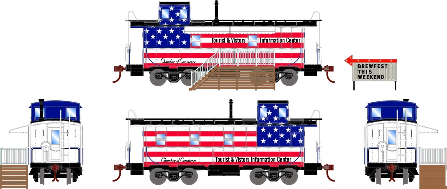 • Decorated menu boards • Stairs and platform for service through caboose side windows